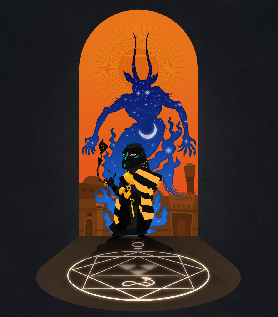 That lead me to find the Ars Goetia from the Lesser Key of Solomon, with a long list of demons and their powers. Among many there was the king Balam, which granted invisibility to demons under their legion. The seal of Balam inspired our visual artist to make a seal of summoning for the protagonist demon, further iterating it to become a sigil of the contract between the summoning sorcerer and the invisible demon. This research was the stepping stone for the narrative designer to follow a more in-depth research to create the sorcerer and the djinn characters.